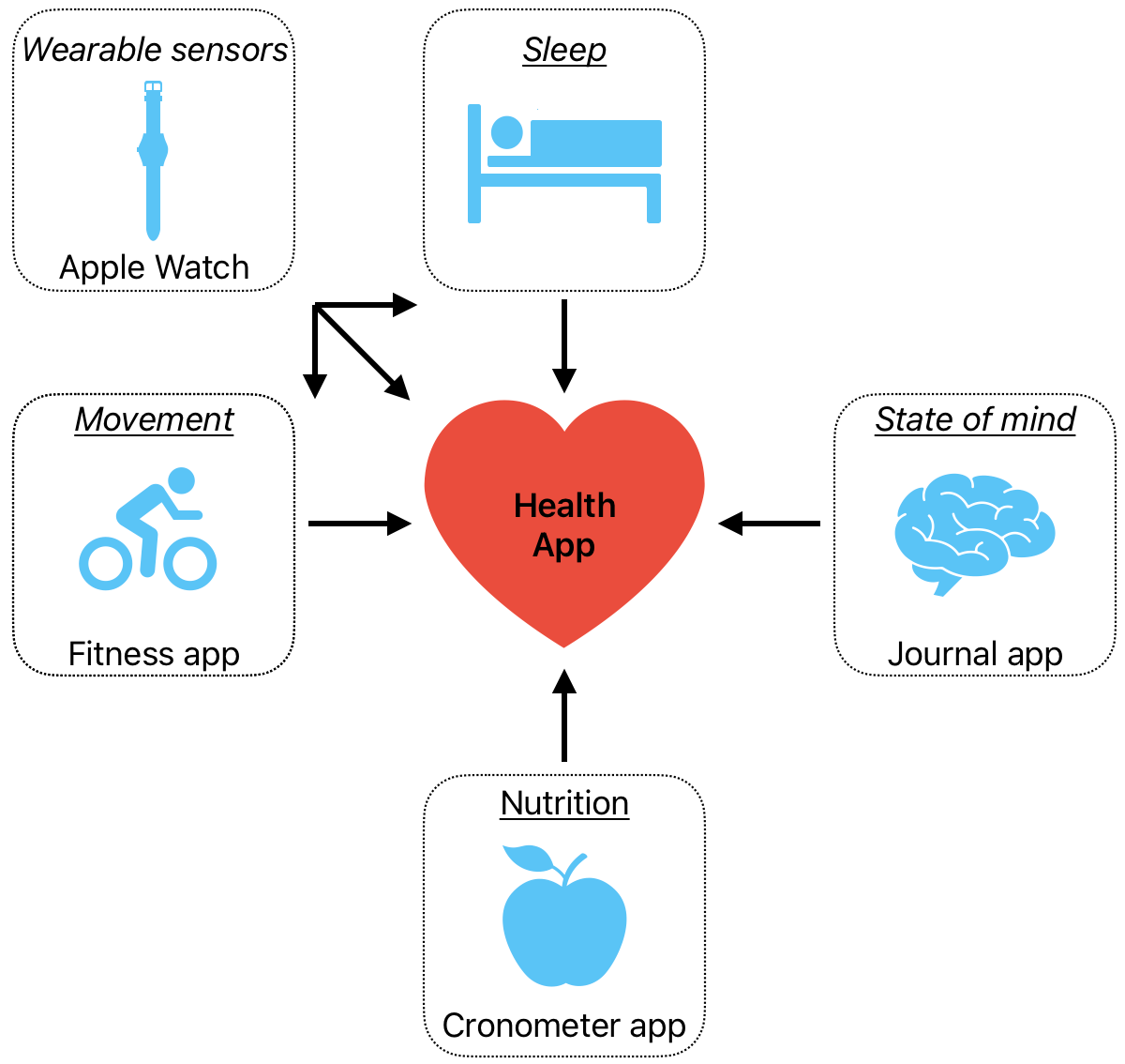 The figure below illustrates this data pipeline. At the center of it is the Apple Health app, which serves as the main data hub. Various activity metrics—such as walking, cycling, and bouldering—are recorded using my Apple Watch (Series 11) and written to the Health app through the Fitness app. Sleep quality is also estimated via the Apple Watch.